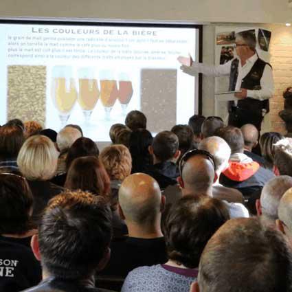 • Présentation animée par le brasseur : exposé sur la composition et fabrication de la bière, ainsi que sur les produits issus de la Distillation, le tout illustré de vidéos …